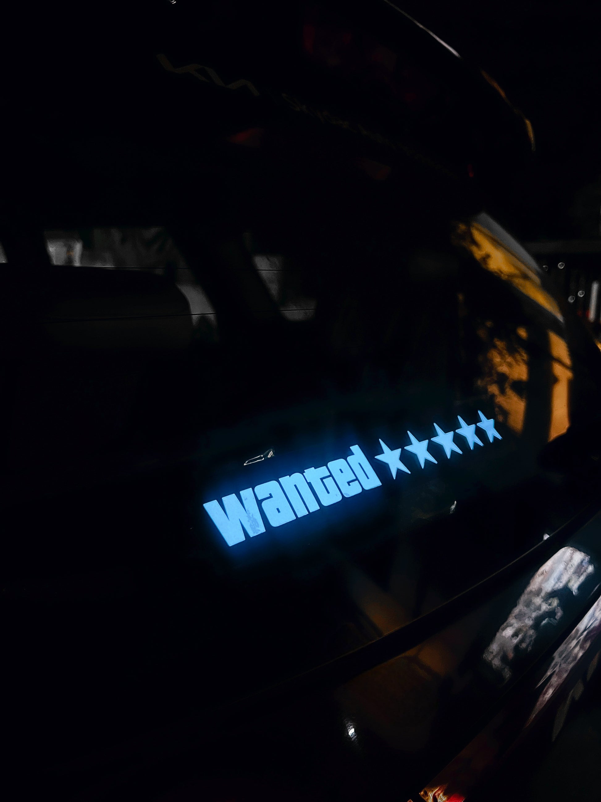 - Vibrant LED sign featuring a bold “Wanted” design inspired by street racing culture and GTA.